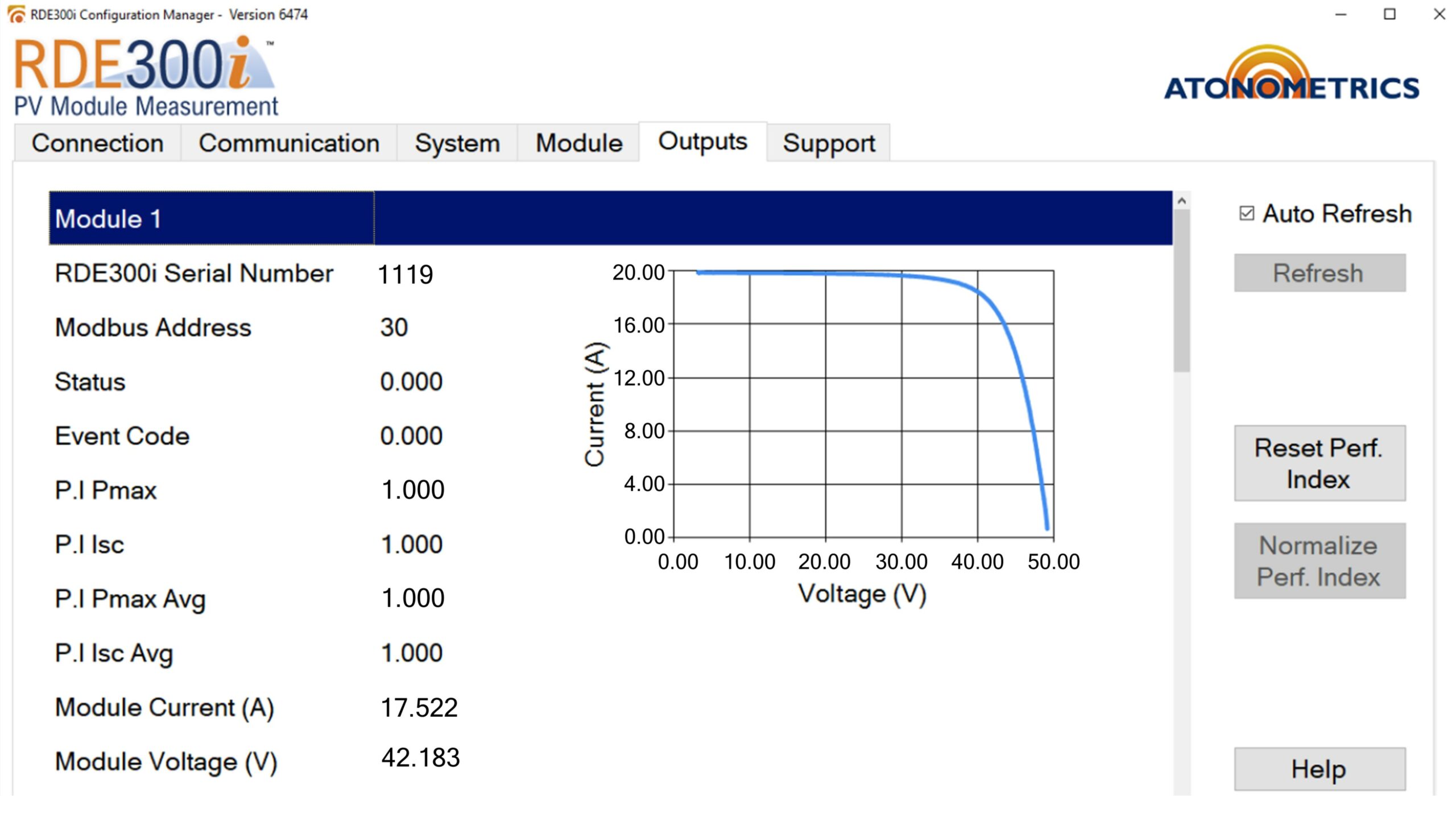 O RDE300i foi projetado para funcionar com uma ampla variedade de tipos de módulos fotovoltaicos, incluindo cristalinos ou de película fina, bifaciais ou monofaciais. Ele tem uma ampla faixa de entrada e pode medir até 30 A, 250 V e 1500 W. Ele se conecta facilmente ao seu sistema SCADA, fornecendo dados de saída pelo protocolo Modbus RTU sobre RS485.